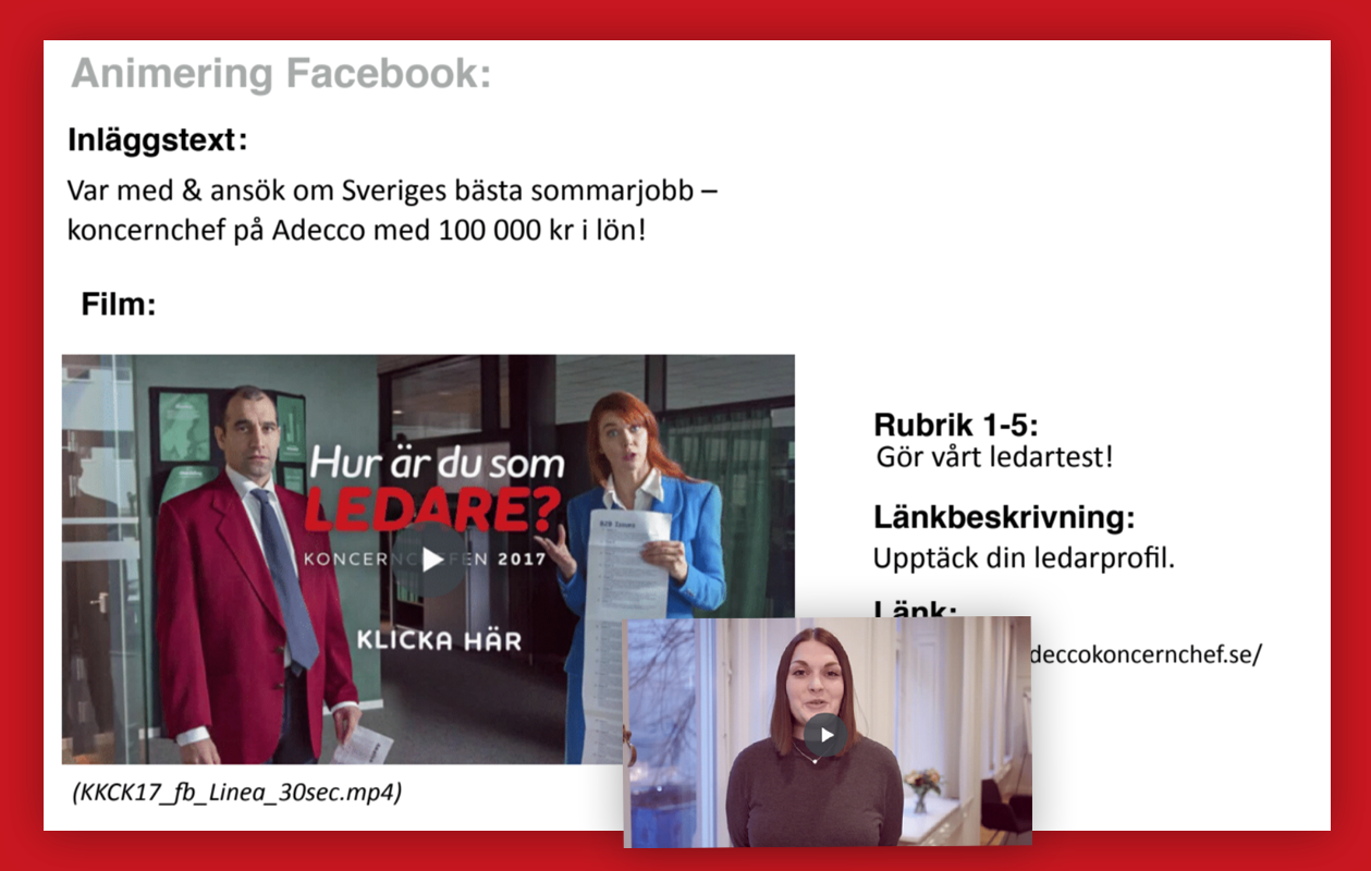 Min roll: rådgivning i samband med rekryteringskampanj riktad till unga vuxna. Stöd i strategiska val inom manus, rubriksättning och design. Framtagning och optimering av annonser för sociala medier. Coachning av medarbetare på Adecco.